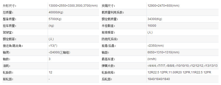 | 轮胎规格 | 12R22.5 12PR,11.00R20 12PR | 钢板弹簧片数(前/后) | -/8/8/8,-/9/9/9,-10/10/10 |