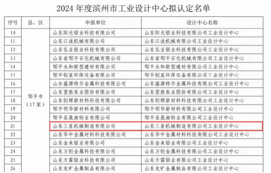 近日,滨州市工信局对《2024年度滨州市工业设计中心拟认定名单》进行公示,山东三星集团机械公司通过滨州市工业设计中心认定。